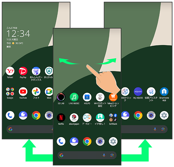 各シートを左右にフリックすると、ホーム画面シートを切り替えることができます。