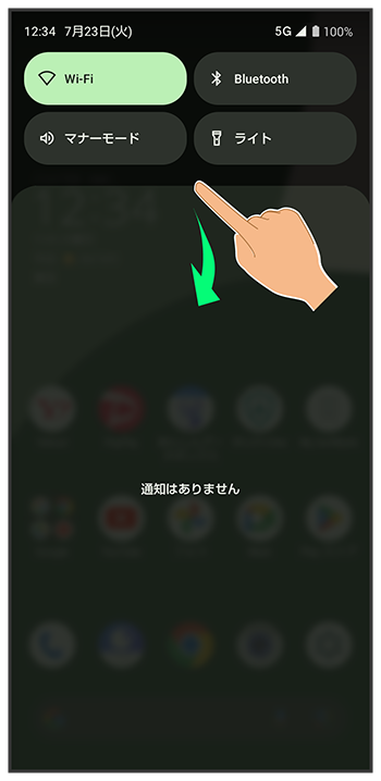 - 通知パネルが開いてない状態で、ステータスバーを2本の指で下にフリックしても、クイック設定パネルが表示されます。