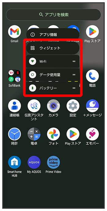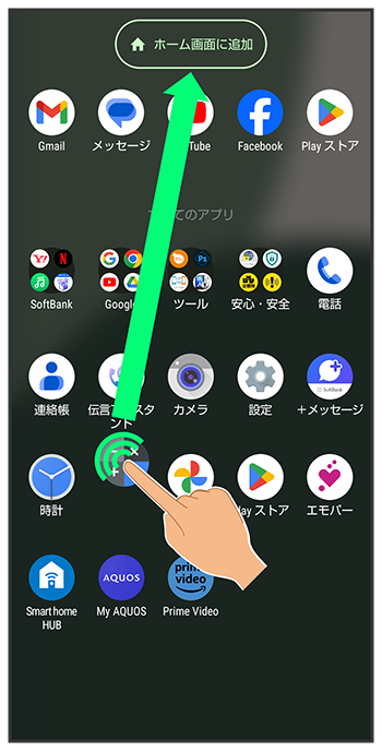 アプリ一覧画面でアプリをロングタッチし、「ホーム画面に追加」までドラッグ