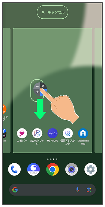 - 画面の端に表示されるシートまでドラッグすると、シートを切り替えて機能のショートカットを追加できます。一番右端のシートまでドラッグすると、シートを1枚増やして追加できます。