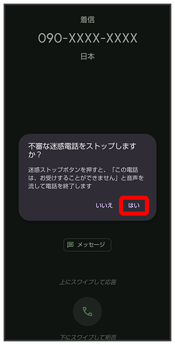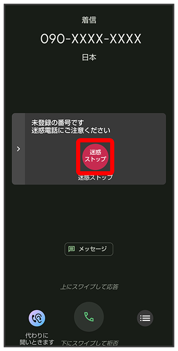 不明な相手の電話を「迷惑ストップ」ボタンでお断りする
