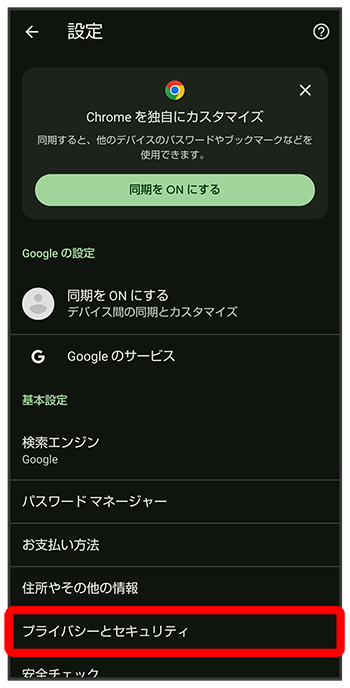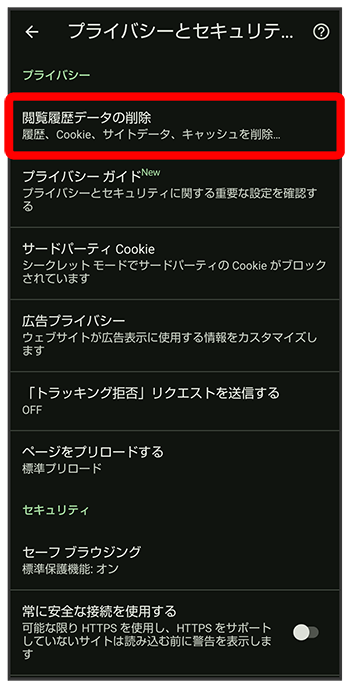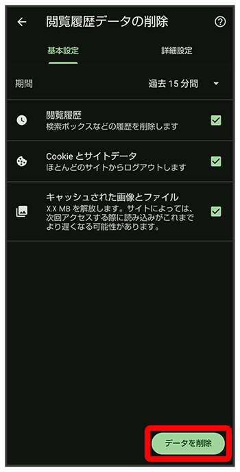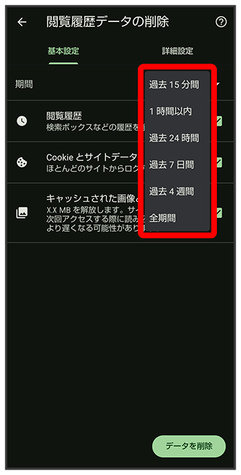 期間を選択削除する情報の種類を設定と操作しても、閲覧履歴データを削除できます。