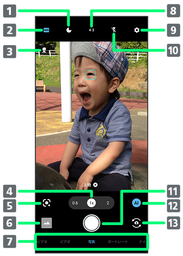 - インカメラの場合、有効にするとフラッシュの代わりに画面全体が発光し、夜の自撮りでも人物が明るく撮れます(セルフィーフラッシュ)。