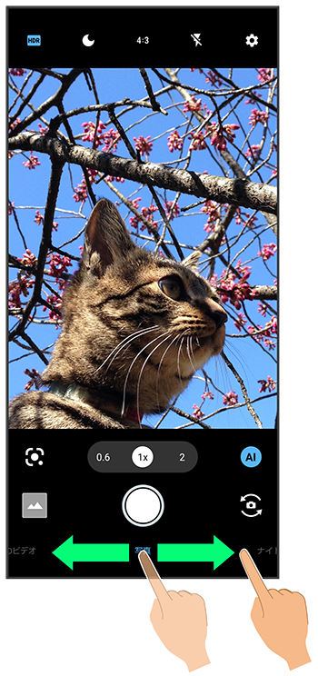 - 画面下部の撮影モードを左右にドラッグすると、からは