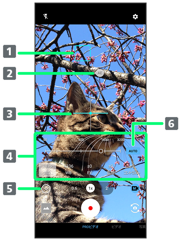 各設定の数値をタップすると、調節バーが表示され、設定を手動で調節することができます。 - 撮影設定表示エリアの表示(