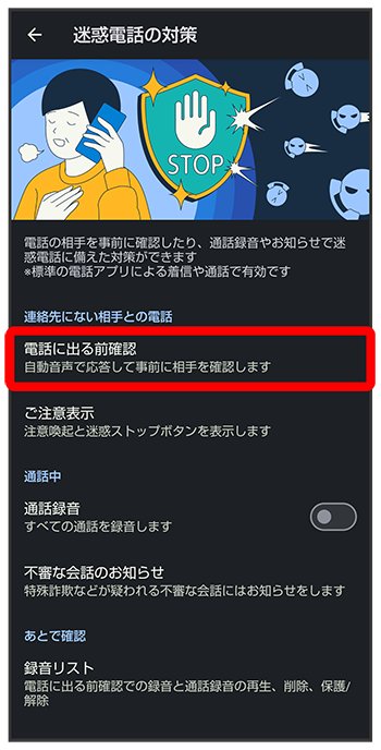 電話に出る前確認画面で自動音声のモードをタップ自動音声が応答するまでの時間を設定する