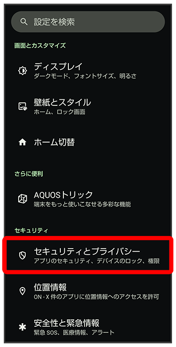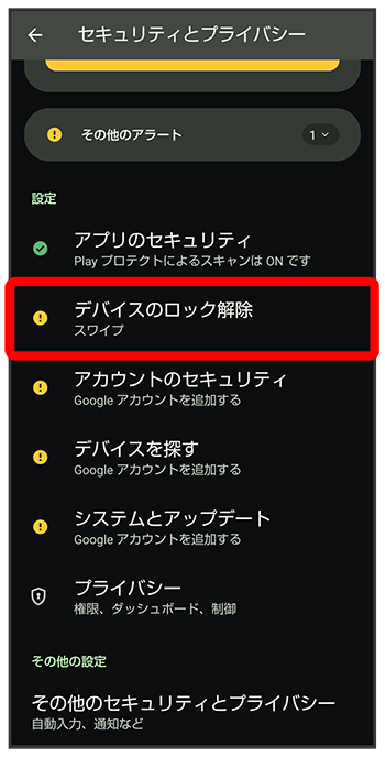- 画面ロック解除方法の設定について詳しくは、「パターンを指でなぞって画面ロックを解除するように設定する」、「ロックNo.(PIN)で画面ロックを解除するように設定する」、「パスワードで画面ロックを解除するように設定する」を参照してください。