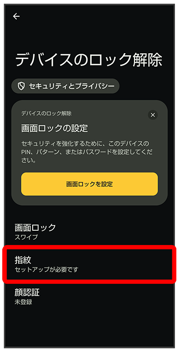 セキュリティとプライバシー画面でパターン/ロックNo.(PIN)/パスワードを入力登録した指紋のこんなときは