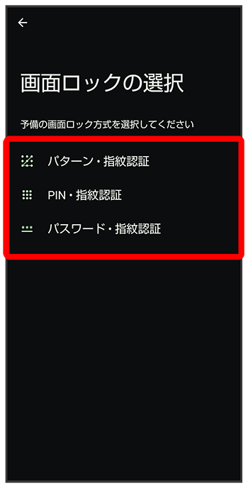 - 指紋認証ができないときの予備の画面ロック解除方法になります。