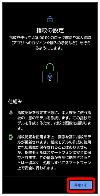 - 指紋センサーに指を触れたまま指紋の登録や認証を開始すると、起動できない場合があります。指を離し、再度操作してください。