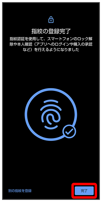 - 指紋の登録完了画面が表示されるまで繰り返してください。