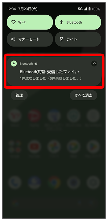 が表示されます。ステータスバーを下にフリックしてBluetooth®共有通知をタップしてください。