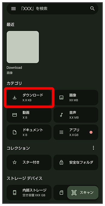 ダウンロード画面で、ファイルをロングタッチ- リスト表示でファイル名の右の