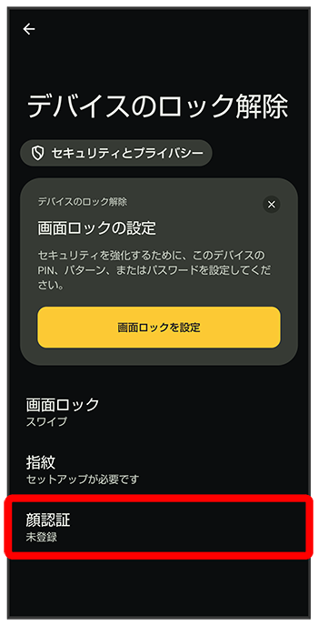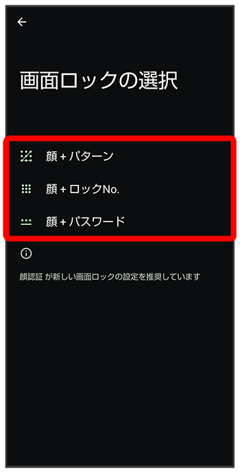 セキュリティとプライバシー画面でパターン/ロックNo.(PIN)/パスワードを入力顔認証についてのご注意