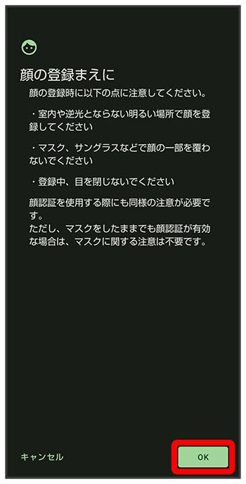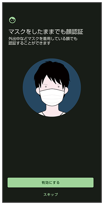 画面のガイドに顔を合わせる「マスクをしたままでも顔認証」について設定