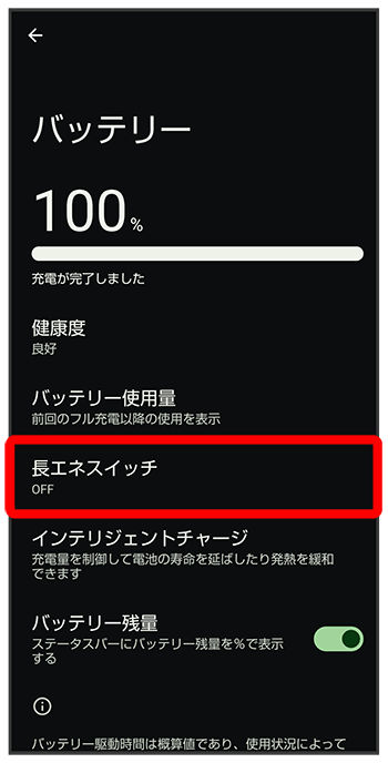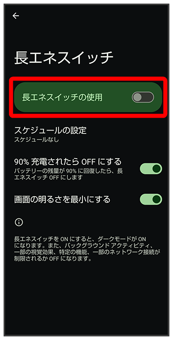 電池残量が90%になったときに長エネスイッチを自動的に無効にするかどうかを設定する