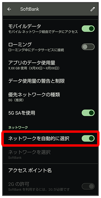 - 自動的に適切な通信事業者に接続するように設定するときは、再度、をタップします(