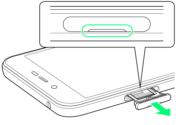 - ディスプレイを上にして、カードトレイを引き出してください。ディスプレイを下にしたり、本機を立てた状態でカードトレイを引き出すと、SIMカードやSDカードがカードトレイから外れ、紛失する可能性があります。