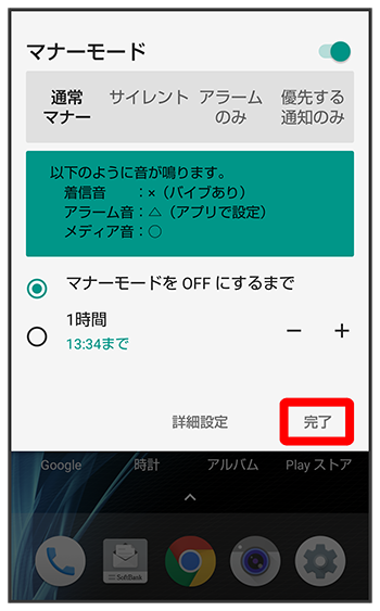 マナーモード設定画面で/をタップして解除するまでの時間を設定- をタップすると、手動で解除するまでマナーモードが有効になります。
