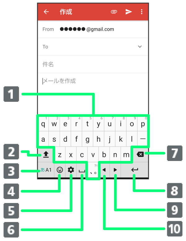 - カーソルを左に移動(上下右にフリックすると、カーソルを上下右に移動。文字入力中は、変換の区切りを変更)