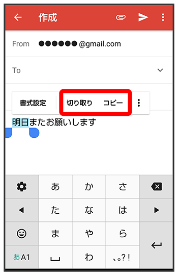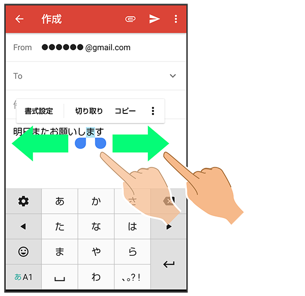 を左右にドラッグして、切り取り/コピーする文字を選択