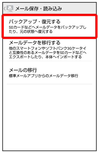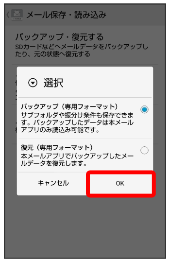 - 本体に保存されているメールデータをバックアップします。メールデータを1件ずつ選択してバックアップすることはできません。