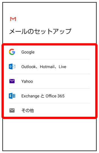 - すでにGoogle アカウントでログインしている場合は、アカウント設定画面は表示されません。別のアカウントを追加するときは、「アカウントを追加する」を参照してください。