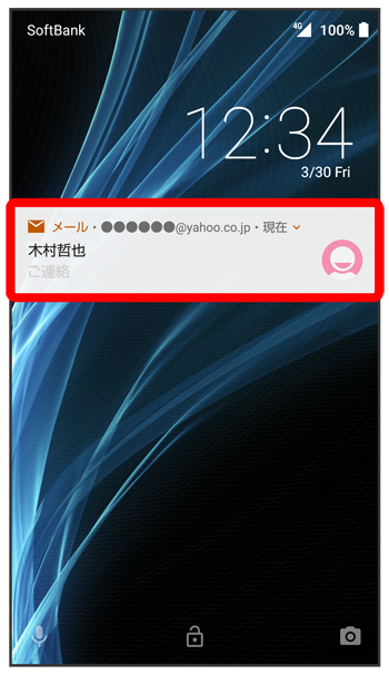 新着メールを受信すると、ロック画面に新着メッセージ通知が表示されます。