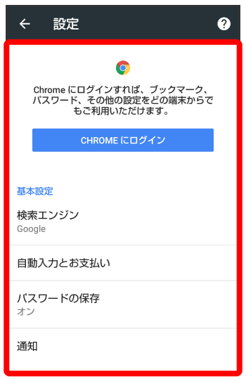| CHROME にログイン | Google アカウントでログインして、タブやブックマーク、履歴などの設定を利用できます。ログインすると、アカウント情報が表示されます。 |