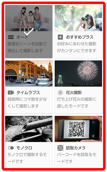 | おすすめプラス | 被写体に合わせて設定を調整したり、撮影シーンを選んで撮るモードです。詳しくは、「撮影画面(おすすめプラス)の見かた」を参照してください。 |