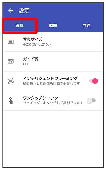 | ワンタッチシャッター | 画面をタップして撮るかどうかを設定します。 |