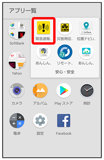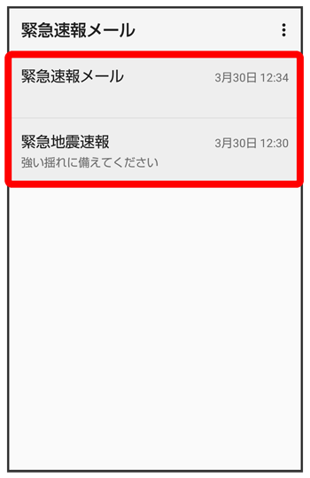 緊急速報メール受信メッセージ一覧画面が表示されます。