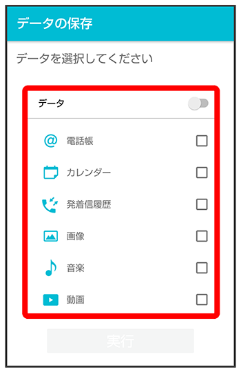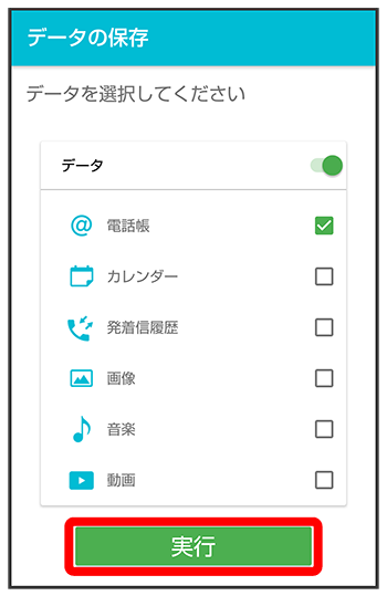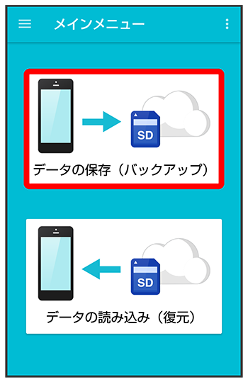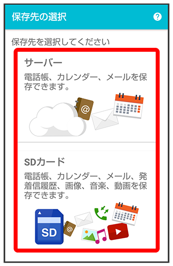 本体の電話帳データ/カレンダーデータ/発着信履歴データ/画像データ/音楽データ/動画データ/メールデータを、サーバー/SDカードに保存します。