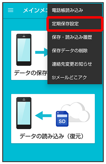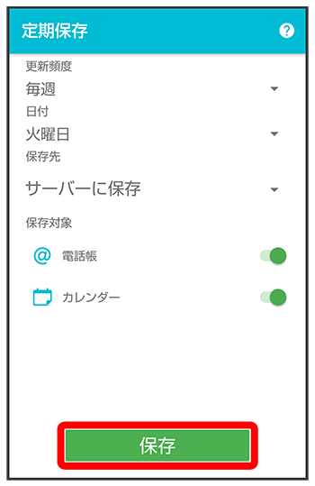 本体の電話帳データ/カレンダーデータ/発着信履歴データ/画像データ/音楽データ/動画データを、サーバー/SDカードに定期的に自動で保存します。