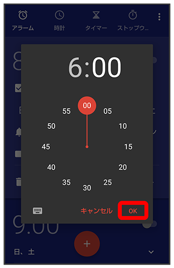 アラーム設定時刻になると、アラーム通知の画面が表示され、アラームやバイブレータでお知らせします。