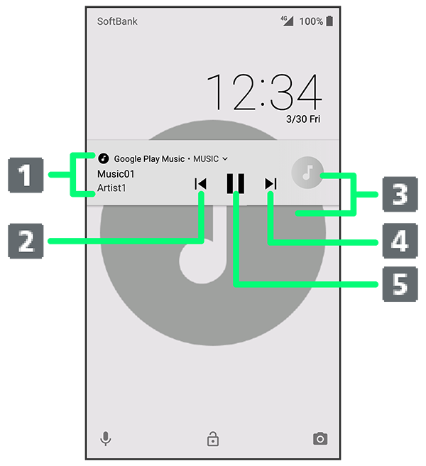 - 曲操作パネルをタップすると、ロック画面で曲の操作ができます。