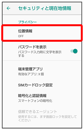 | 位置情報サービス | 位置情報を利用するアプリについて設定します。 |
