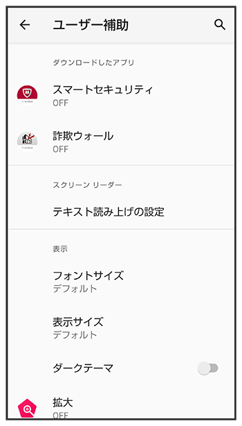 | 詳細設定 | が追加されます。拡大/色補正/色反転のショートカットでを選択した場合、ロック画面でも音量Upキー/音量Downキーを同時に数秒長押しして、拡大/色補正/色反転を使用するかどうかを設定できます。 |