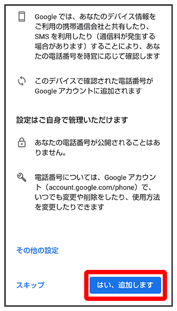- セキュリティ保護目的でのみ電話番号を追加するときは、をタップします。以降は画面に従って操作してください。