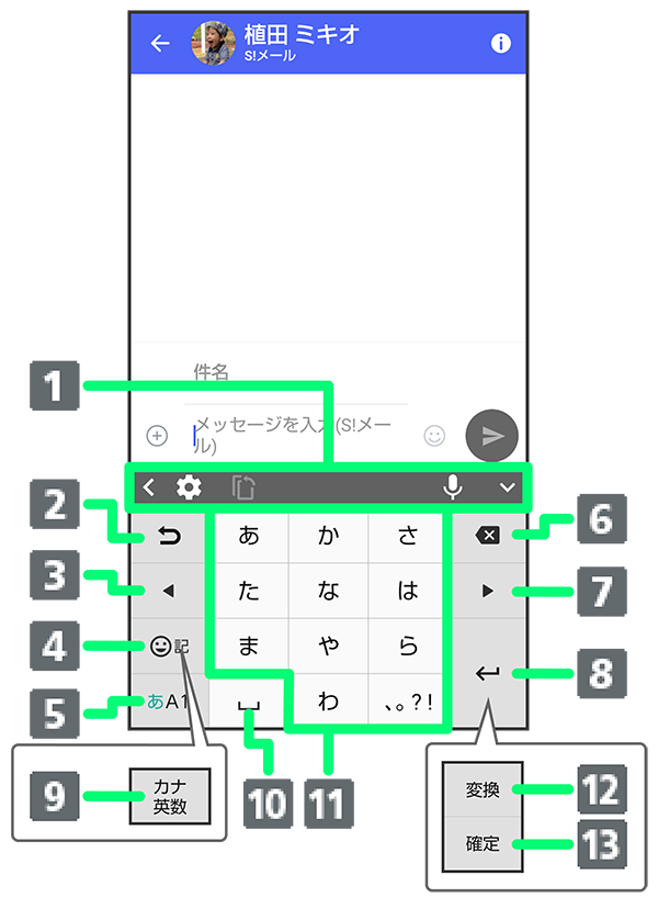 - 絵文字/記号/顔文字を入力(ロングタッチすると、入力拡張プラグインを表示)