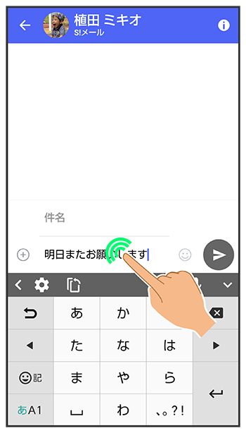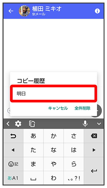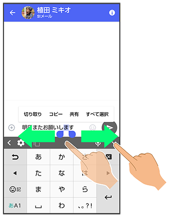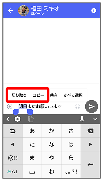 文字入力画面で入力済みの文字列をロングタッチ共有方法をタップ画面に従って操作
