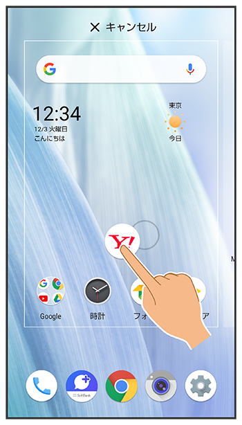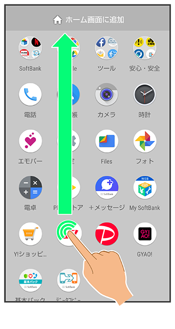 アプリ一覧画面でアプリをロングタッチし、「ホーム画面に追加」までドラッグ