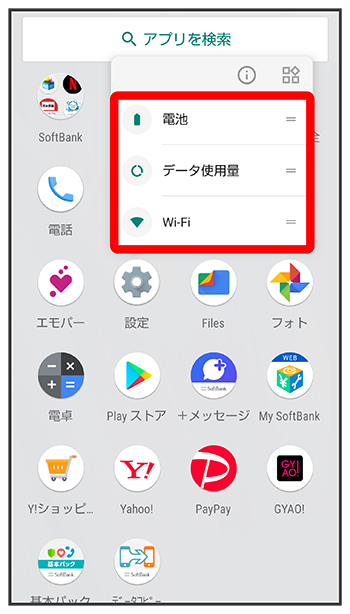アプリをロングタッチすると、アプリにより機能へのショートカットが表示される場合があります。機能ショートカットをロングタッチし、ホーム画面の追加したい位置で指を離すと、機能へのショートカットとして追加することができます。