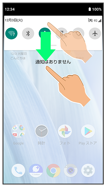 - 通知パネルが開いてない状態で、ステータスバーを2本の指で下にドラッグしても、クイック設定パネルが表示されます。