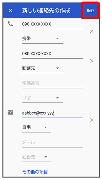 新しい連絡先の作成画面で、削除する項目の![]()