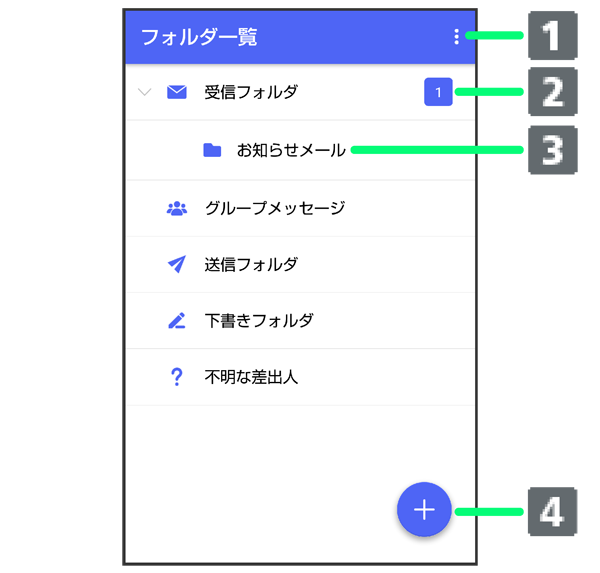 (+メッセージ)起動直後の画面はフォルダ一覧画面になります。フォルダ形式への切り替え方法について詳しくは、「フォルダ形式の表示に切り替える」を参照してください。