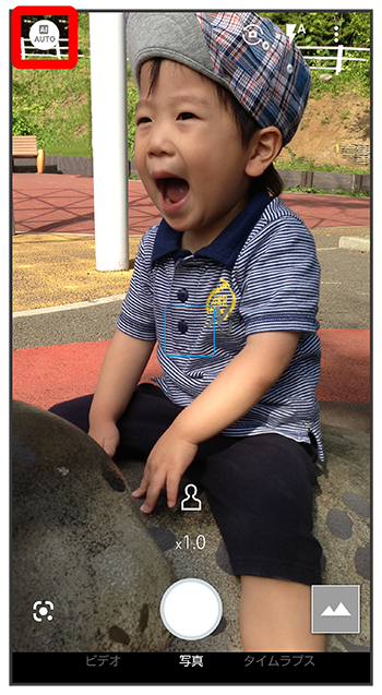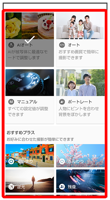 | AIオート | AIが被写体に最適なモードで調節します。 認識したシーンや被写体によって最適な画質やシャッタースピードで撮ります。 白板/黒板を認識した状態で撮影した場合は、確認画面が表示されます。をタップすると、正面から見たような写真へ補正します。 |