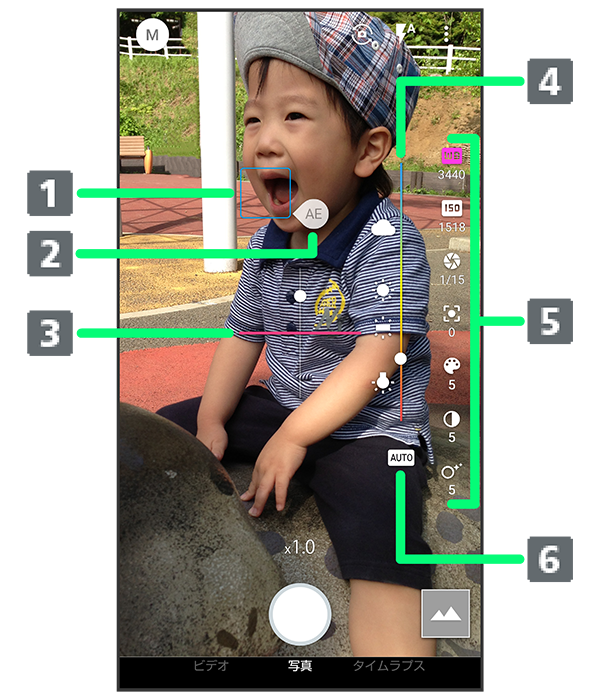 ホワイトバランスやISO感度などの設定ができます。 - オートアイコン