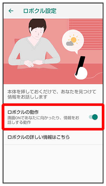 - 有効にすると、本機の電源が入っているとき、ロボクルで充電すると、ディスプレイ点灯時や充電開始、着信、アラームなどに連動してロボクルが回転します。
