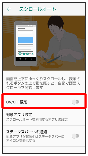 スクロールオート画面でアプリ名をタップ- アプリ名をタップするたびに、有効(